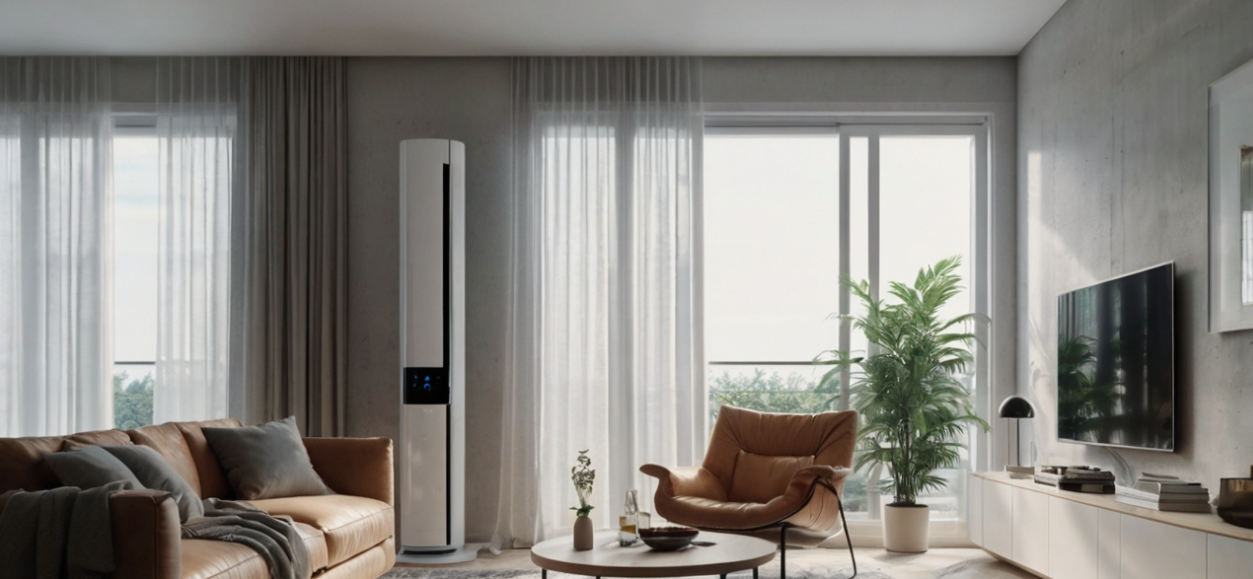 여름철 거실 한복판에서 시원한 바람을 뿜어내는 스탠드형 에어컨!
