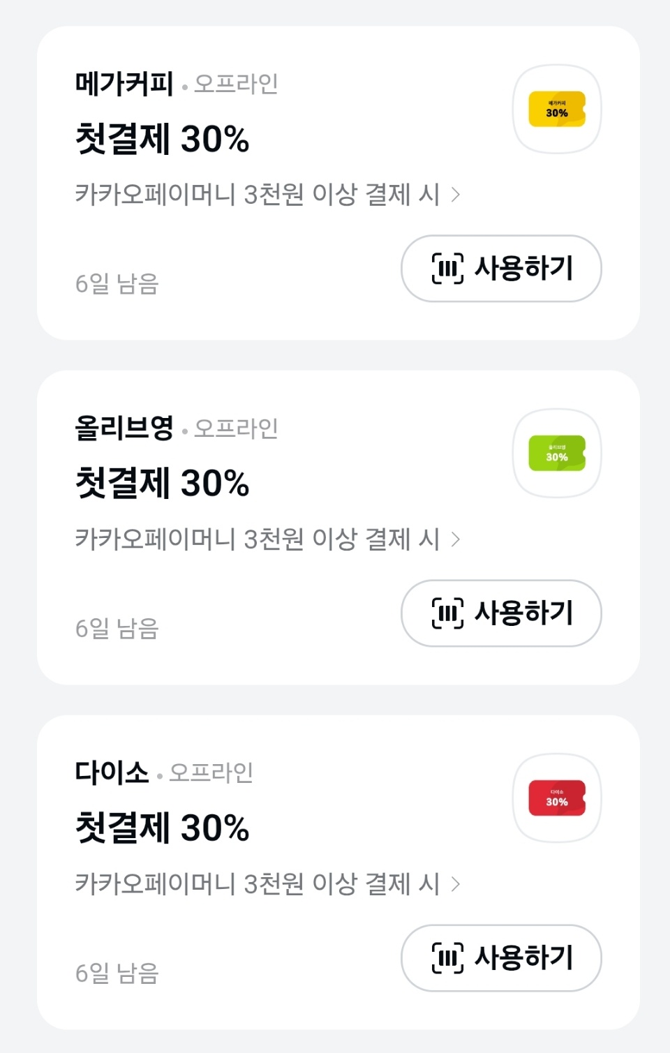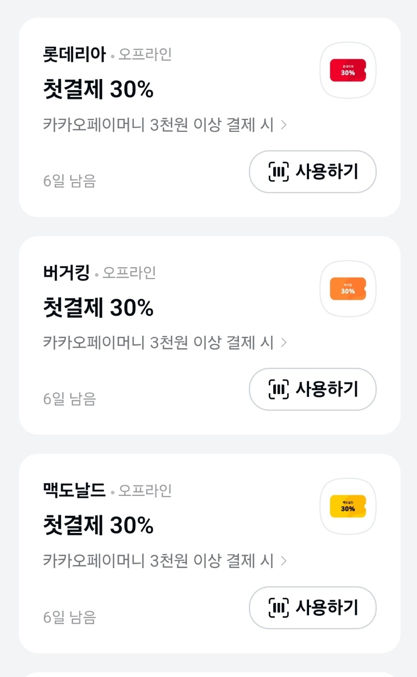 gs25, cu, 세븐일레븐, 이마트24, 메가커피, 빽다방, 다이소, 올리브영, 투썸플레이스, 컴포즈커피, 롯데리아, 맥도날드, 버거킹 등 자주 가는 인기 매장에서 카카오페이로 첫 결제 시 30% 할인을 받을 수 있어요.